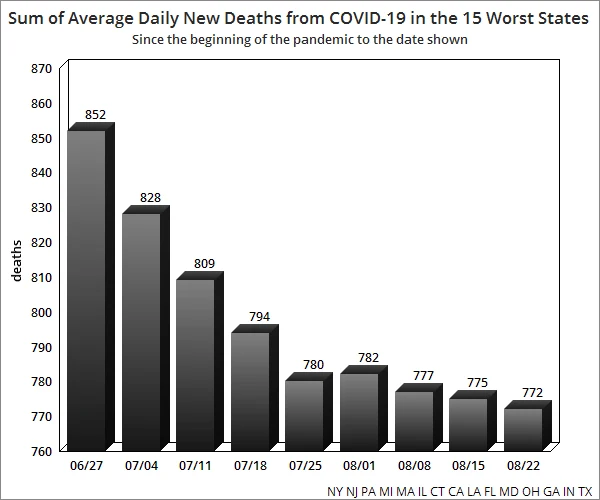 The compound daily growth rate of deaths for the whole country has dropped again in the last week, as has the sum of average daily new deaths in the 15 worst states since the beginning.